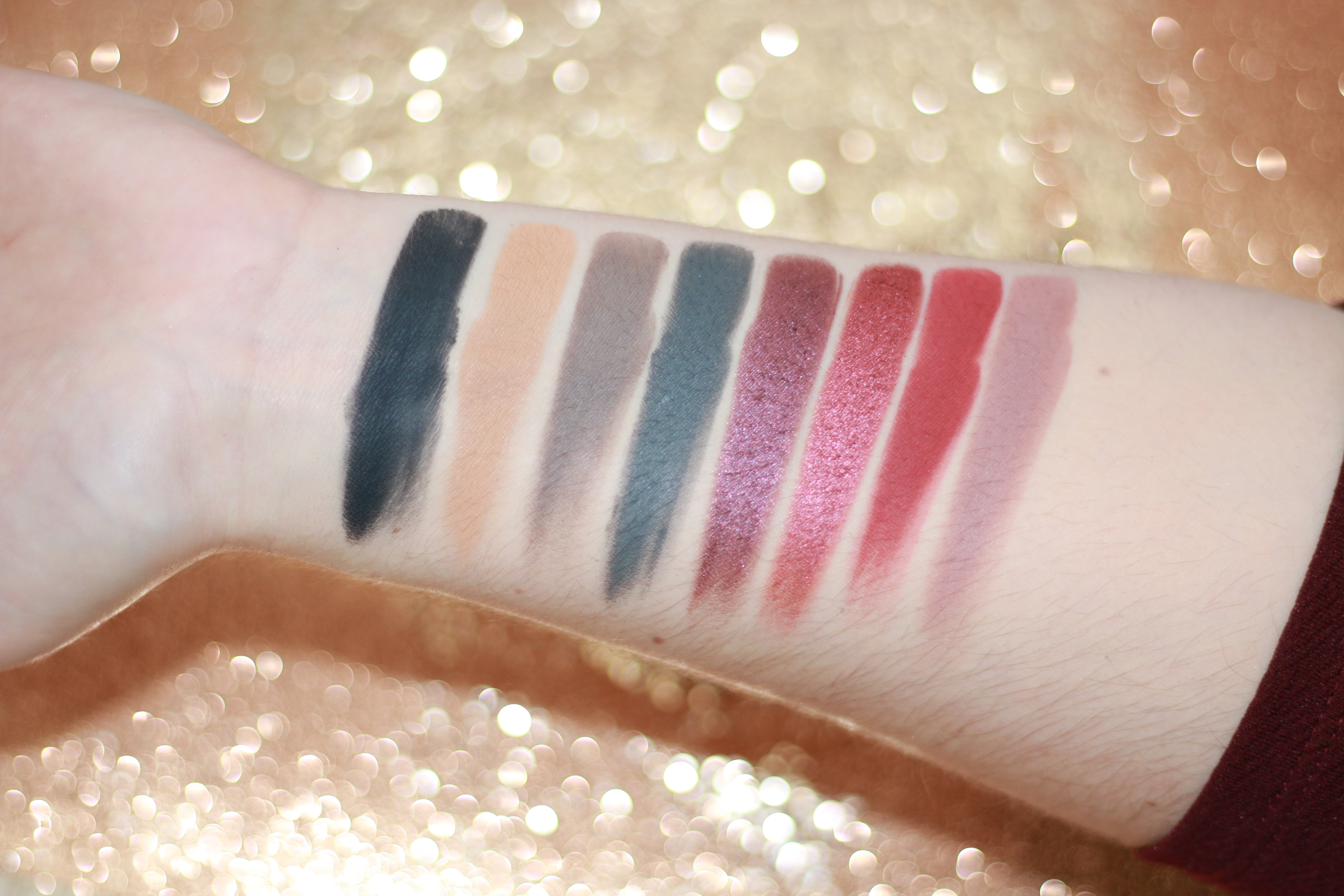 Latex est un bleu foncé aux paillettes argentées, Obsession est un bleu nuit profond mat et Chastity est un doré qui a une texture de paillettes pressées. Shibari est l’un de mes fards favoris, c’est un joli vert kaki satiné. Corset est un violet froid mat et Cuffs un argenté très lumineux idéal pour les fêtes. La Petite Mort ( wtf ce nom de fard à paupières ahaha ? ) est un vert sapin très intense et Submissive un fard pailleté vert kaki assez clair.
