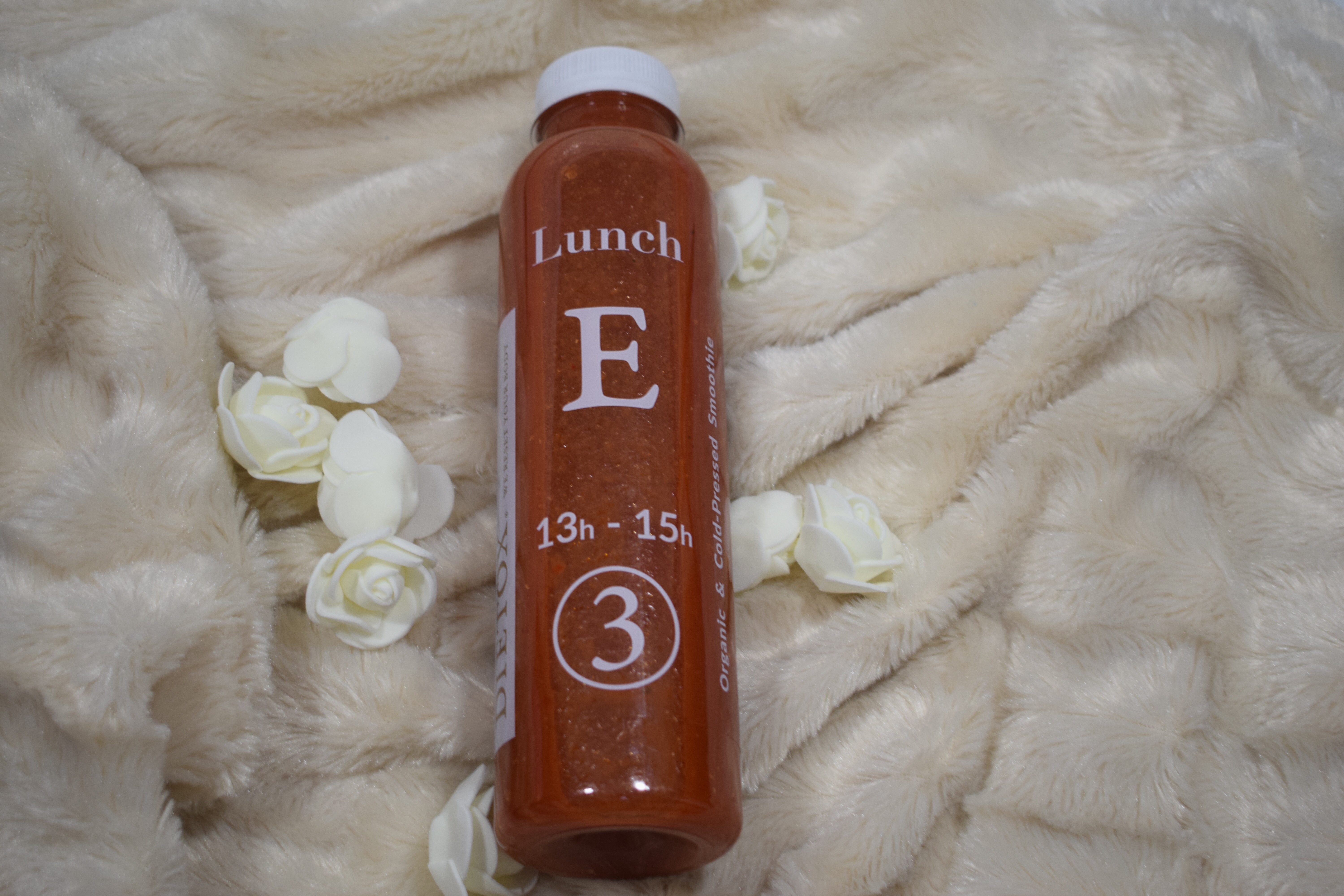 Ce jus était à base de tomate, poivron rouge, concombre, vinaigre de vin rouge, quinoa, oignon, huile d’olive, ail et sel. Une version aux notes salées censé remplacer le midi. Je me suis vraiment forcée à le finir car je sentait que le mélange très fort d’oignon, ail et vinaigre de vin. C’était vraiment trop pour moi et je l’ai trouvé vraiment trop prononcé. C’était vraiment à contre coeur alors que j’adore ma pause du midi et que c’est censé être la coupure plaisir de la journée. Flooop.